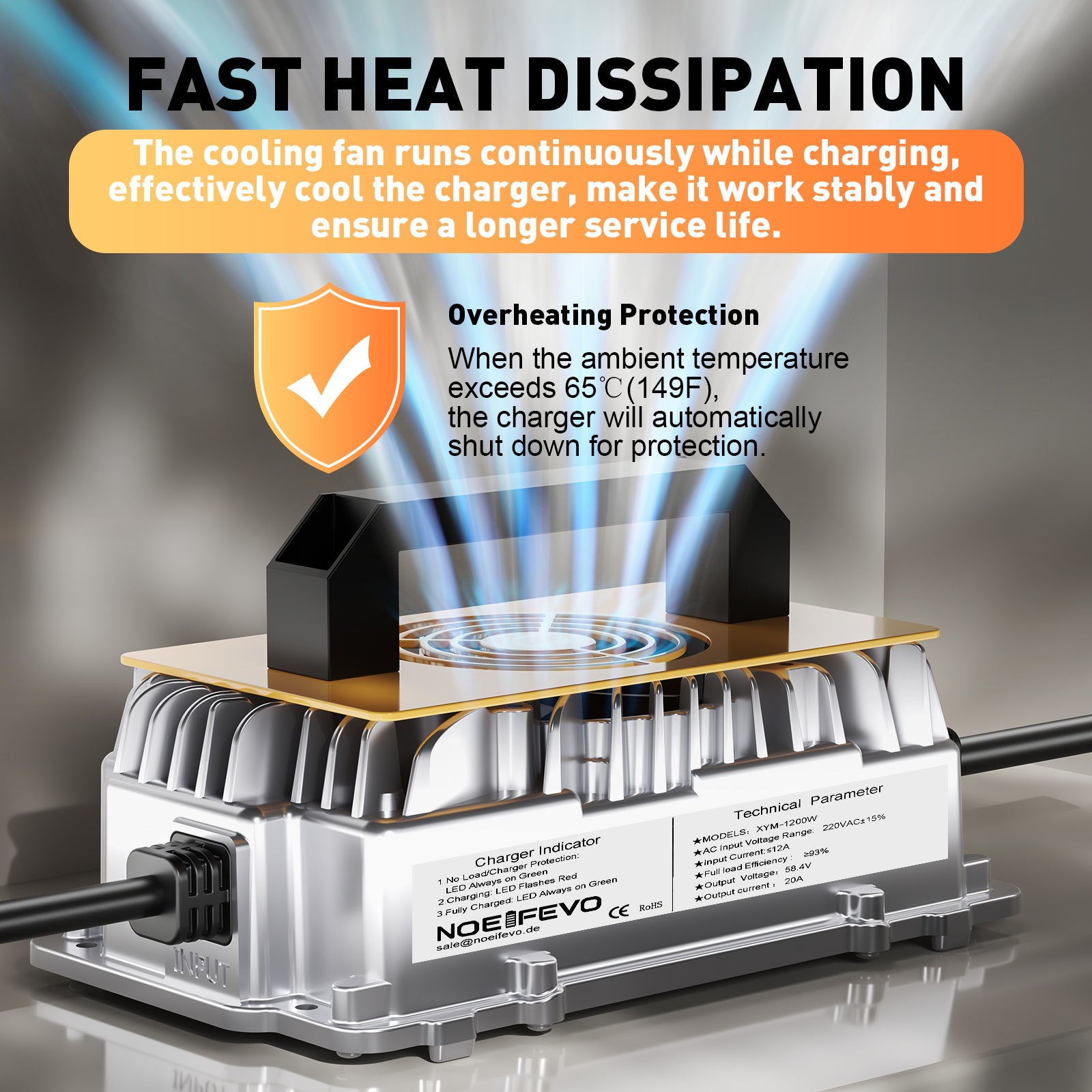 El ventilador de enfriamiento funciona continuamente durante la carga, enfriando eficazmente el cargador y garantizando un funcionamiento estable y una mayor vida útil.