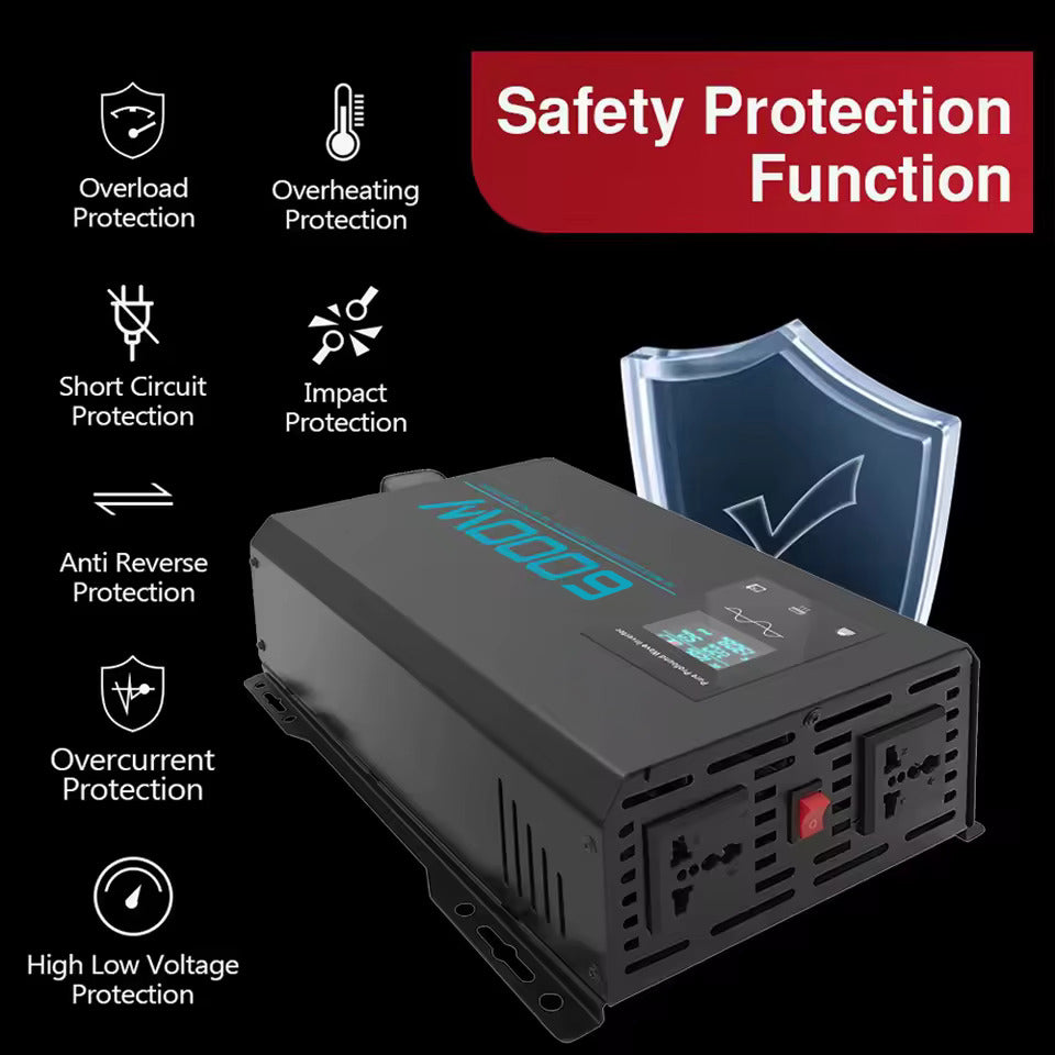 12V & 24V 6000W – Unterstützt sowohl 12V als auch 24V DC-Eingang mit einem 220V AC-Ausgang. Spitzenleistung 6000W, Dauerleistung 3000W.